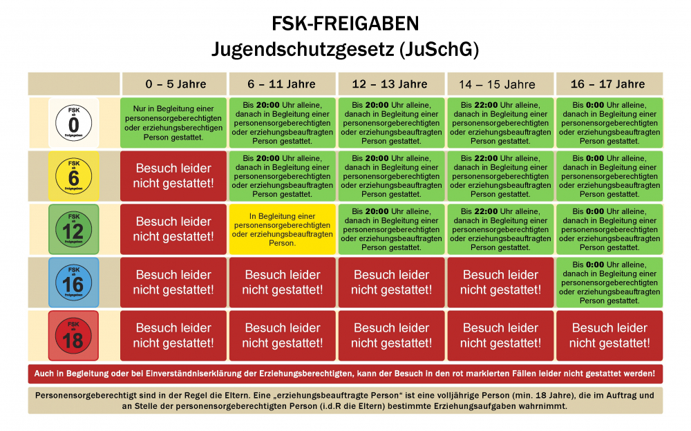 Nachfolgend eine Zusammenfassung der gesetzlichen Bestimmungen zur Einlasskontrolle im Kino (Jugendschutzgesetz):